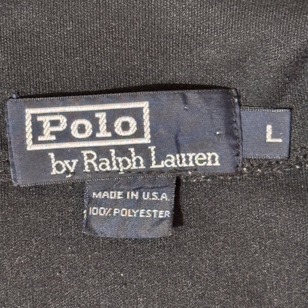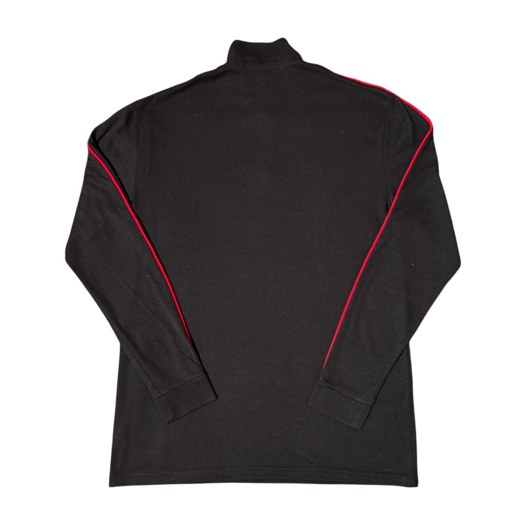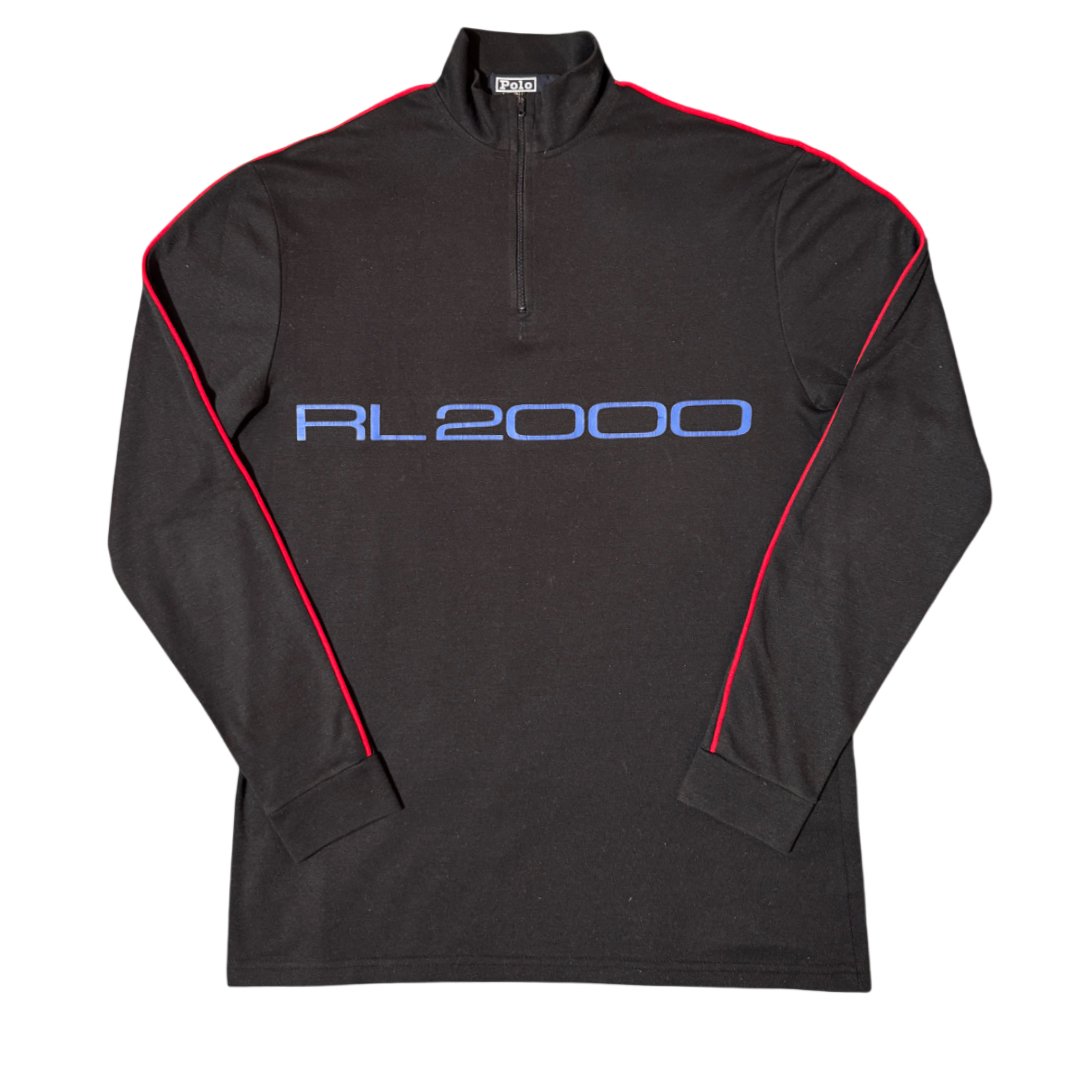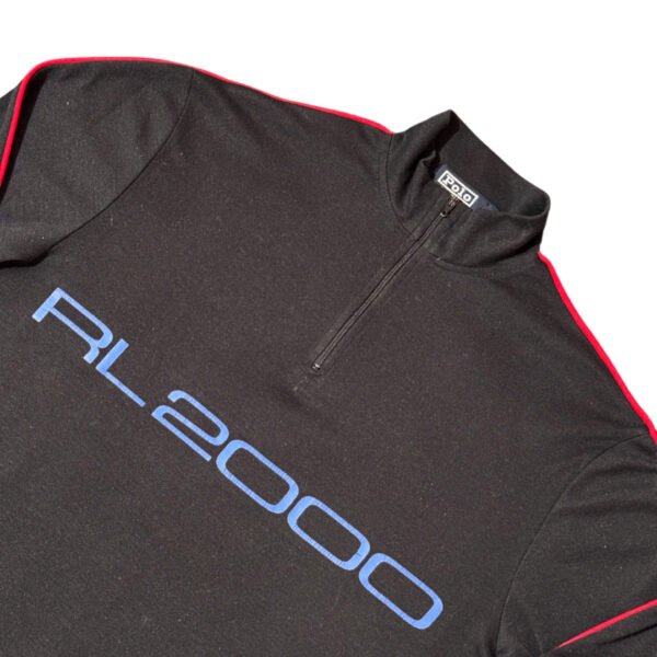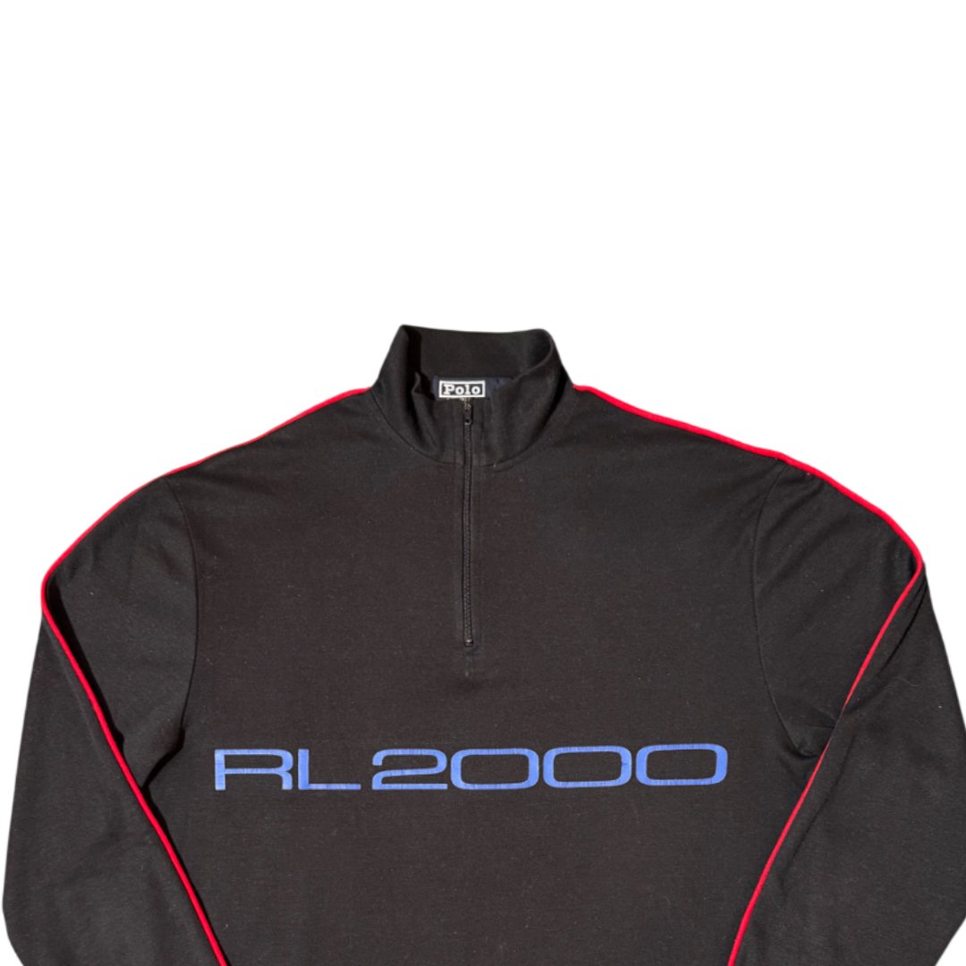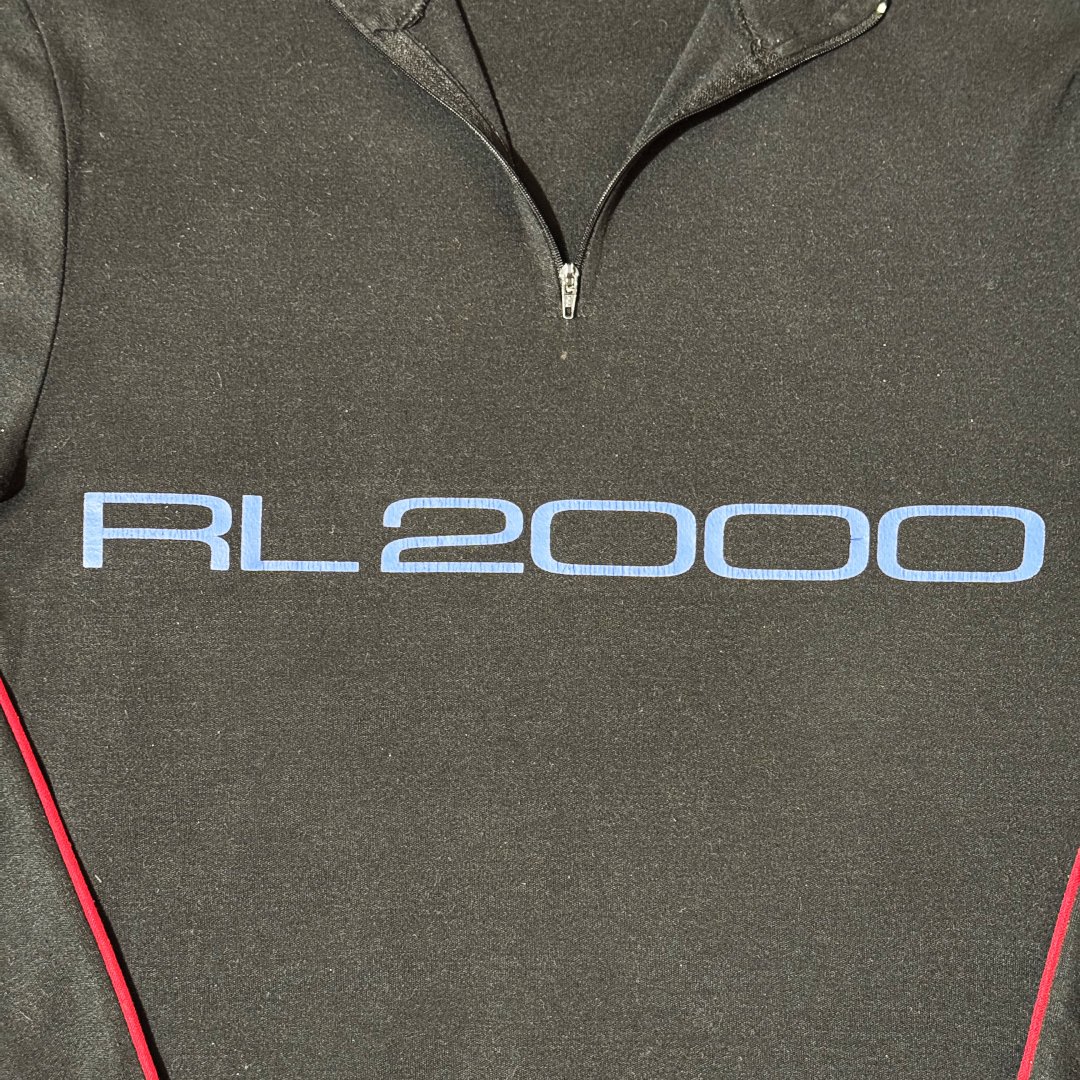 Maglione Polo Ralph Lauren Logo RL2000 OG Edizione originale anni 90, con stampa per il logo e ricamate patch tecniche per lo sport sui gomiti; colore nero, con dettagli rifiniture rosso con stampa frontale e zip tecnica. Materiale leggero e molto attillato, ideato per un fit sportivo per migliorare le prestazioni.
