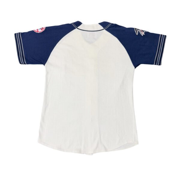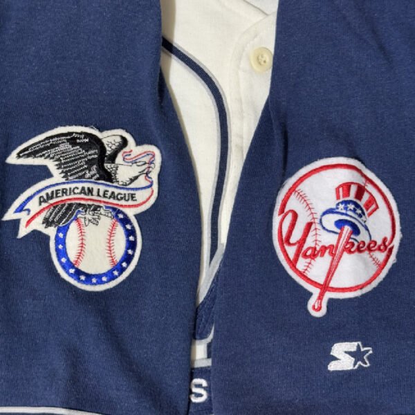 Maglia da baseball Starter MLB New York Yankees colore bianco e blu scuro con ricamo blu scuro e bianco e patches colorate.