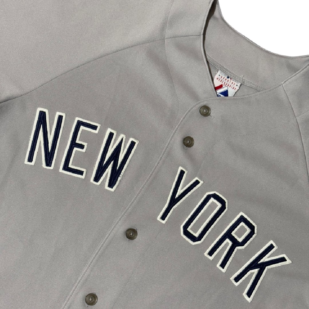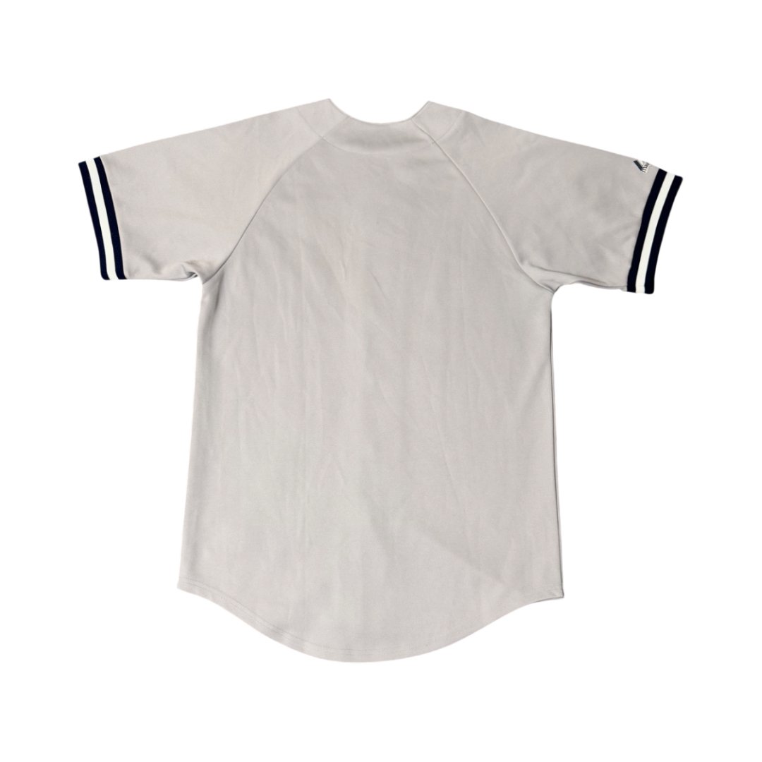 Maglia da baseball Majestic MLB New York Yankees colore grigio con ricamo blu scuro e bianco.