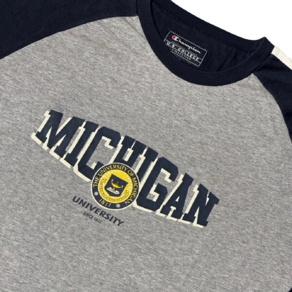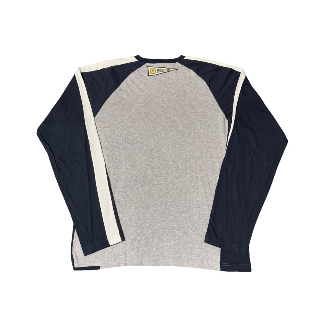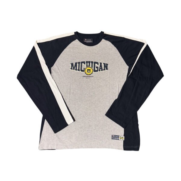 Maglia a maniche lunghe Champion NCAA Michigan Wolverines colore grigio, blu scuro e bianco con stampa blu e giallo.