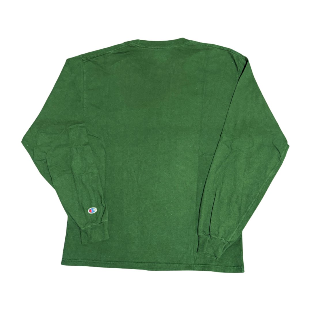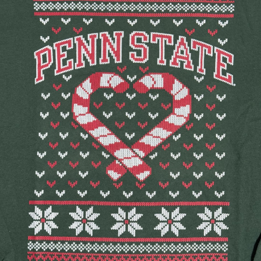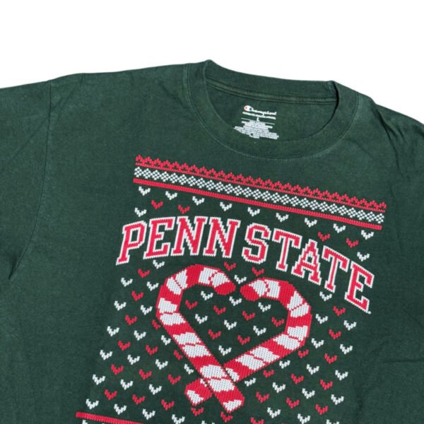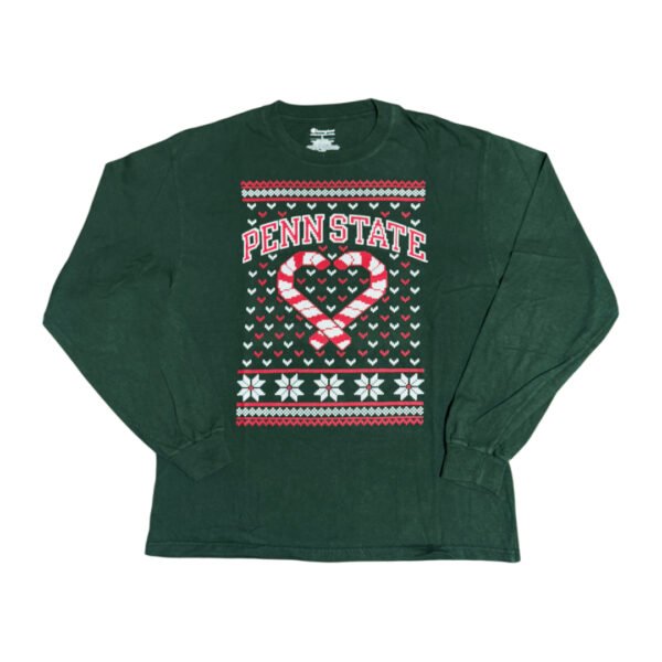 T-Shirt a maniche lunghe Champion NCAA Penn State Univeristy verde scuro con stampa natalizia logo colore rosso e bianco.
