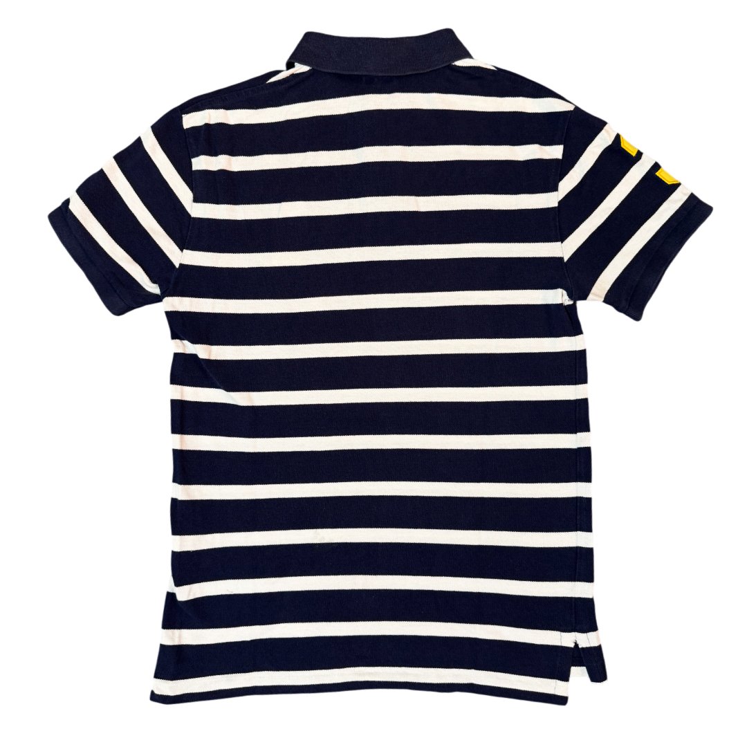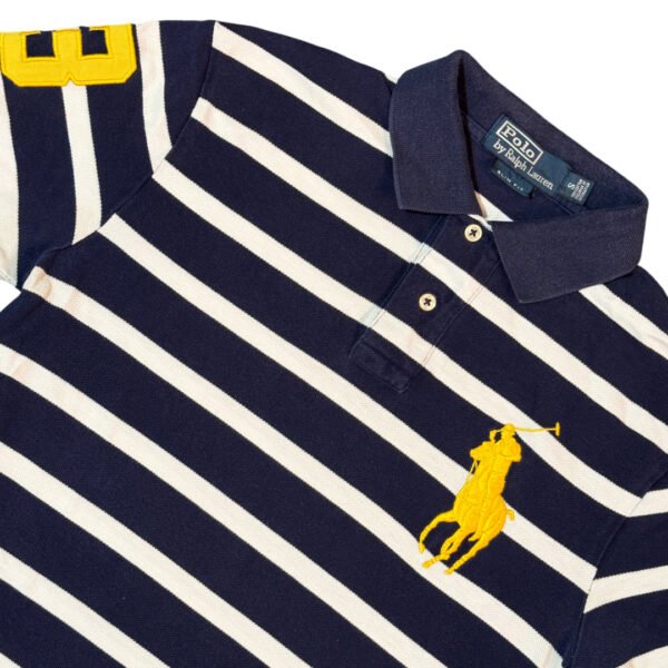 Maglia Polo Ralph Lauren logo Pony grande con dettagli logo ricamato e bottoni e numero 3 ricamato sulla manica, colore grigio e nero a righe con logo colore giallo.