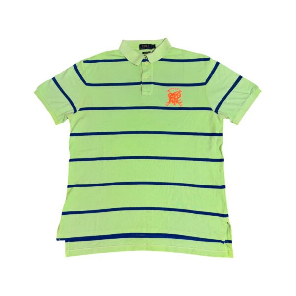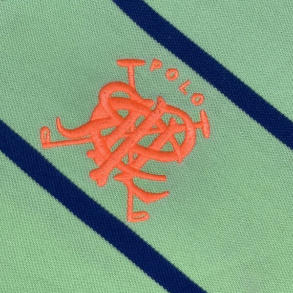 Polo a maniche corte Polo Ralph Lauren colore verde chiaro e blu a righe con ricamo Scribble arancione.